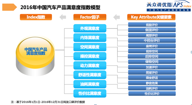 本报告指数是基于对汽车的外观、内饰、空间、操纵、动力、舒适性、油耗、性价比等8个维度及14个细分指标的综合分析研究,可以较为全面地反映车主对于各品牌汽车产品的满意度情况。