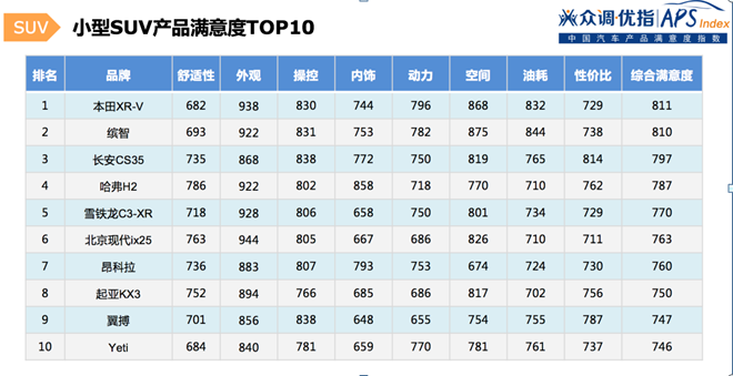小型SUV外观优势明显,得到众多消费者的好评,然而此类车型舒适度稍有欠缺,在内饰、动力性能方面也不占优势,因此性价比并不突出。本田XR-V及缤智分别占据一二把交椅,各项性能平均且处于中上水平,外观及空间性能尤其突出,由此得到较高的综合满意度。长安CS35性价比评分最高,但囿于较低的外观、空间及油耗评分,综合满意度只能屈居第三。