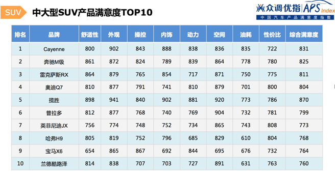 根据本产品满意度指数报告,SUV市场满意度普遍较高,在5个SUV细分市场冠军榜中,德系占据细分市场2席,美系、日系、自主品牌各占1席。其中,别克昂科威、保时捷Cayenne、奔驰GL级的市场满意度评分较高。
