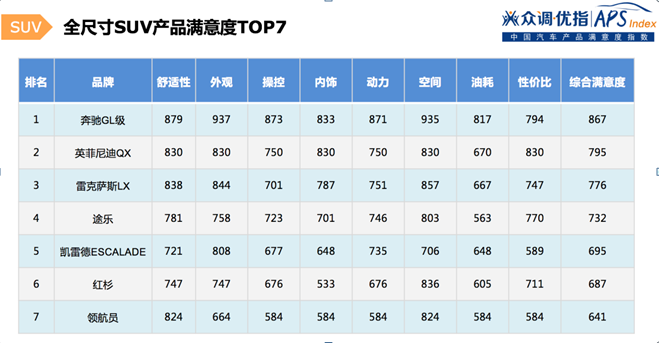 全尺寸SUV以尺寸作为最重要诉求,因此经济性、成本、操控等性能会有所牺牲,性价比也较低。此满意度排行中,奔驰GL级产品满意度遥居首位,除性价比稍弱,其他性能指标如舒适度、外观、操控、动力等均远超其他全尺寸SUV。车联网装备、加速提速、转向性能、电动座椅减速隔音、油品是该细分市场明星车型评价重点。而英菲尼迪QX与雷克萨斯LX操控性能不如奔驰,油耗性能没有跟上大尺寸车型的配置,但仍凭借大气的外观及空间使用性能排名第二和第三。