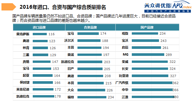 雷克萨斯在进品牌中名列综合质量榜首;国产品牌观致综合质量紧追福特,目前国产品牌车辆质量与合资品牌与进口品牌差距越来越小
