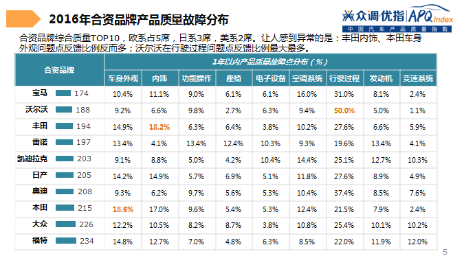 • 合资品牌综合质量TOP10,欧系占5席,日系3席,美系2席。让人感到异常的是:丰田内饰、本田车身外观问题点反馈比例反而多;沃尔沃在行驶过程问题点反馈比例最大最多。