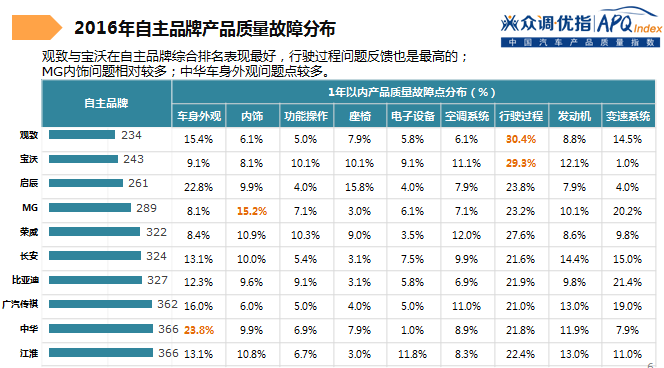 • 观致与宝沃在自主品牌综合排名表现最好,行驶过程问题反馈也是最高的;MG内饰问题相对较多;中华车身外观问题点较多。
